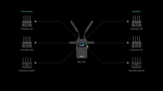 Cada transmisor CineView 2 puede enviar la imagen de forma inalámbrica a cualquier combinación de unidades receptoras CineView dedicadas y dispositivos inteligentes (iOS y Android), hasta un total de cuatro.
