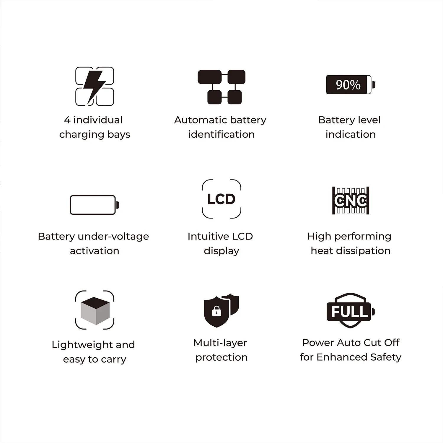 El cargador está equipado con cuatro posiciones de carga independientes y cuenta con un modo de carga inteligente que detecta automáticamente los tipos de batería y ajusta la corriente de salida en consecuencia, cargando cada batería de forma individual para una eficiencia óptima y una larga vida útil. También admite la reactivación de la batería en caso de subtensión, lo que permite reactivar de forma segura las baterías profundamente descargadas.