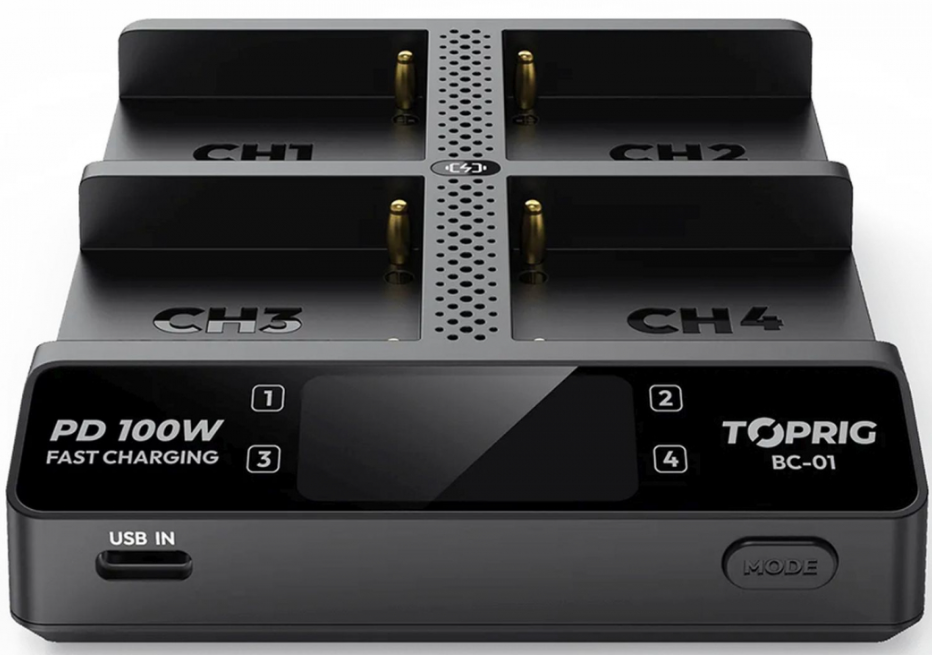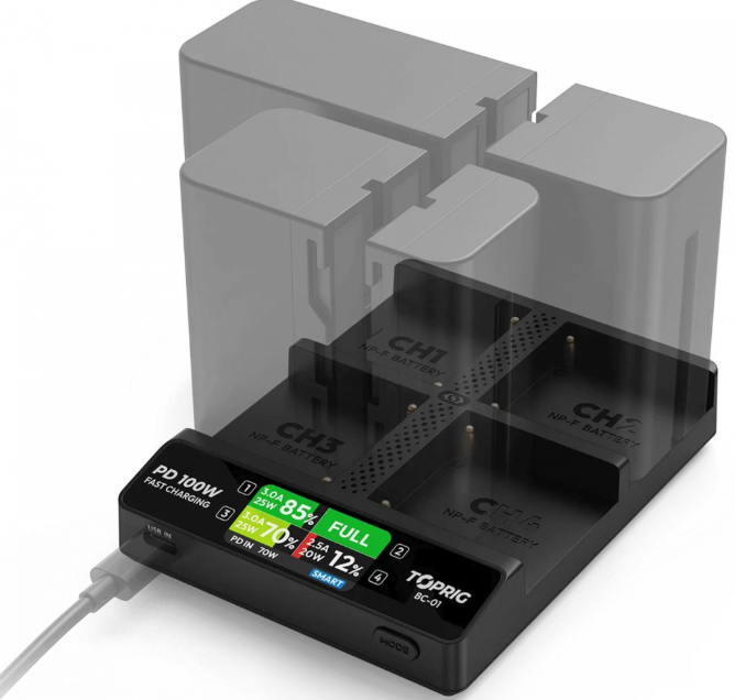El Accsoon TopRig 100W 4-Bay NP-F Fast Charger con cargador GaN para la UE es un cargador inteligente de alto rendimiento diseñado para baterías NP-F. Cuenta con cuatro ranuras de carga independientes, detección automática de baterías y una entrada USB-C PD de 100 W para una carga rápida, estable y segura.
