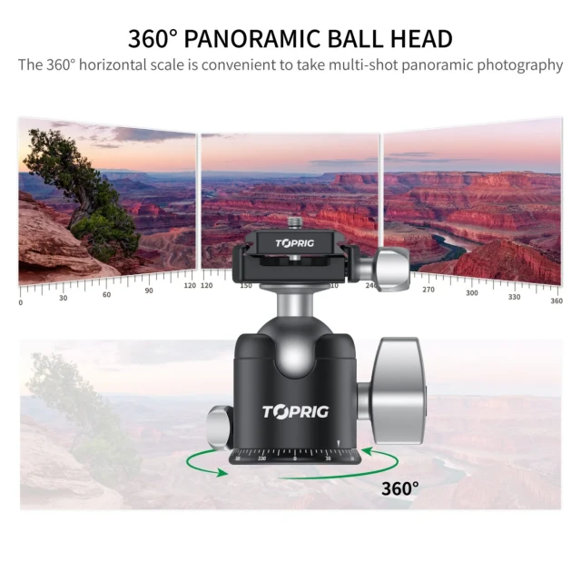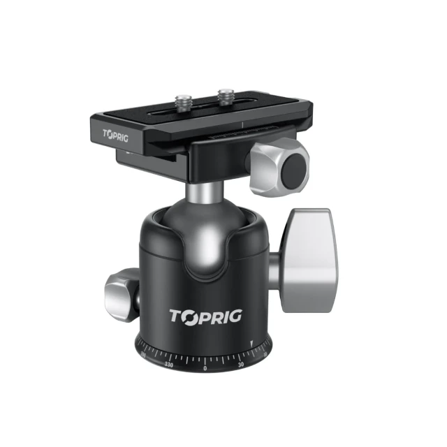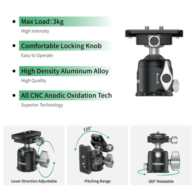 La Accsoon ACC-BH-01 TopRig Ball Head es una rótula de aluminio compacta pero potente, con giro panorámico continuo de 360°, placa de fijación rápida y amplia compatibilidad con cámaras, trípodes y monopiés.