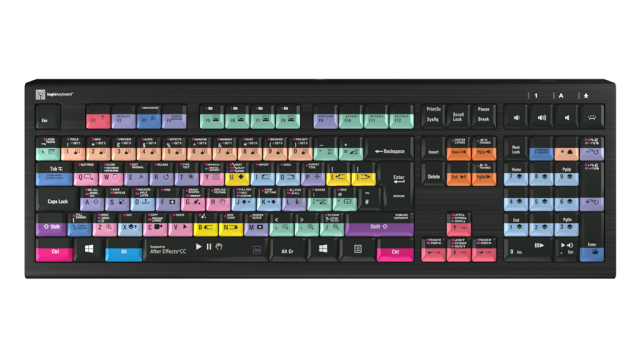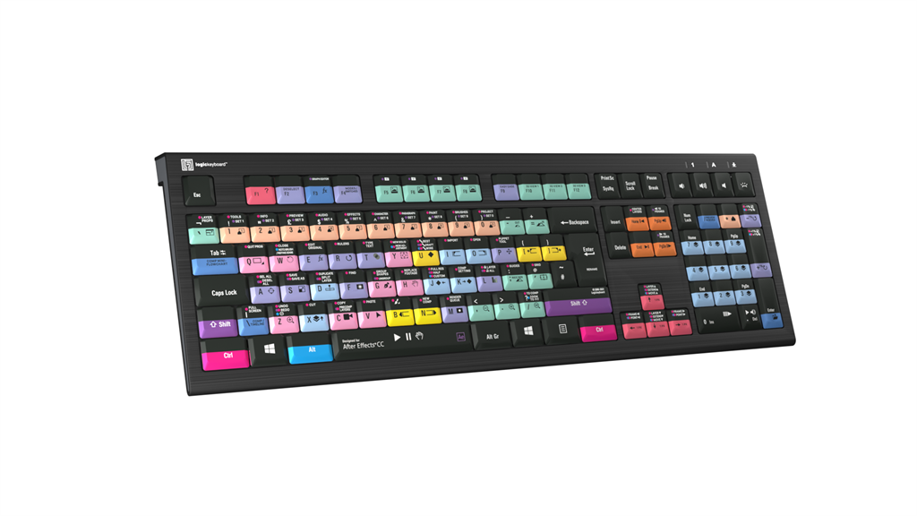 El teclado especial Logickeyboard para Adobe After Effects también incluye todas las letras, números y símbolos habituales que se encuentran en un teclado estándar, por lo que puede utilizarse fácilmente como sustituto de este. El teclado se conecta fácilmente y no requiere la instalación de ningún software.