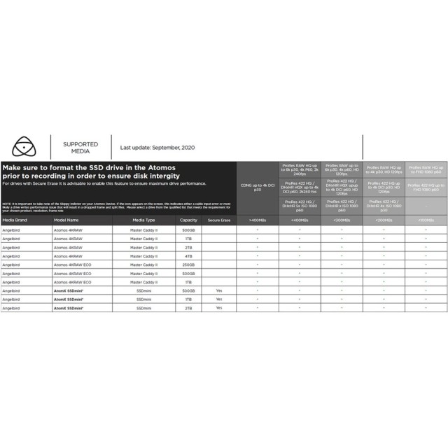 El disco AtomX SSDmini de Angelbird se ha fabricado a medida para el nuevo monitor-grabador Atomos Ninja y es totalmente compatible con todos los demás grabadores disponibles. El disco AtomX SSDmini es un 20 % más pequeño que un disco SSD estándar (para adaptarse al reducido tamaño del modelo Ninja), ofrece 1 TB de capacidad de almacenamiento, tiene una velocidad constante de lectura de 540 MB/s y de escritura de 500 MB/s, captura CDNG hasta una resolución de 4K a 30p, ProRes RAW HQ 5,7K hasta 30p, además de 4K 60p y 2K 240p, cuenta con un conector SATA III y es compatible con la tecnología Stable Stream™, gracias a la cual nunca perderás ningún fotograma.