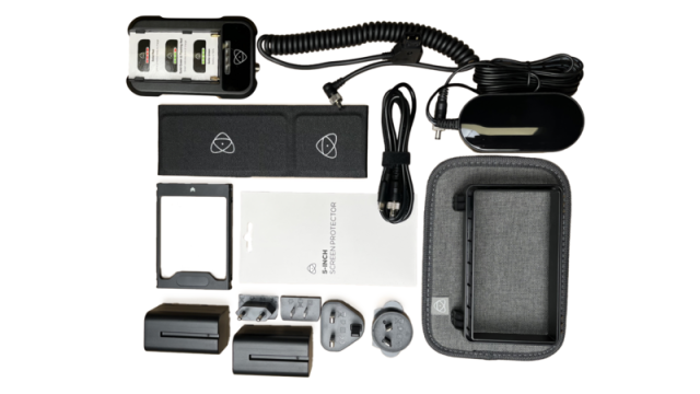 El kit de accesorios Atomos de 5" para los modelos Ninja y SHINOBI incluye: un parasol, una cubierta protectora para la pantalla, un cable de CC, un cargador rápido, dos baterías NP-F750 de 5200 mAh y una funda de EVA