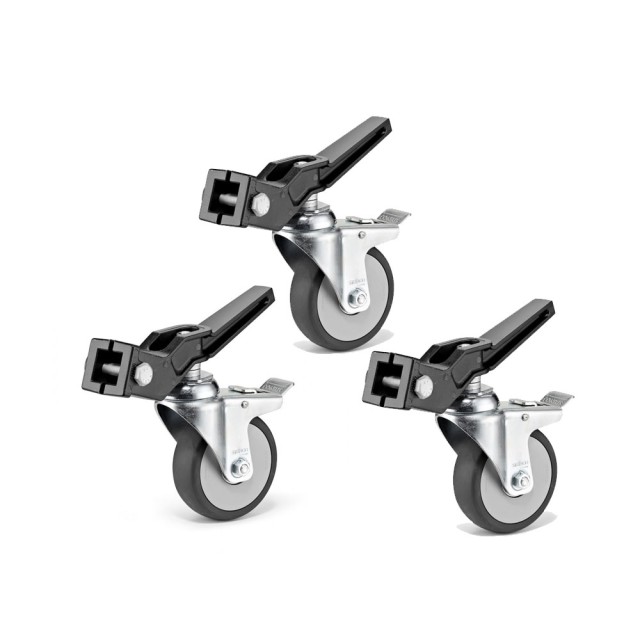 El juego de ruedas con frenos Avenger A9000NB es un conjunto de tres ruedas con frenos de color negro, con un diámetro de 10 cm, fabricadas en metal plateado. Estas ruedas están diseñadas para los extremos cuadrados de las patas de los trípodes de iluminación con dimensiones de 20 x 20 mm o 25 x 25 mm, como por ejemplo los trípodes Avenger Combo: A125B, A115B, A475B, A105B.