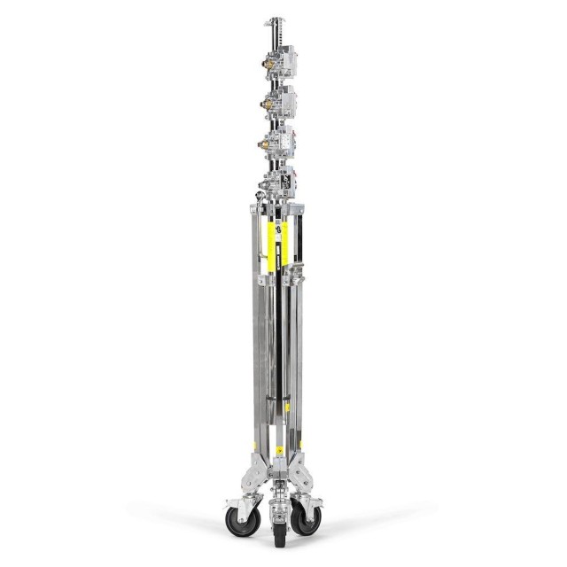 El soporte está fabricado en acero cromado con componentes de aluminio fundido por gravedad y cuenta con una estructura de múltiples secciones que proporciona una resistencia y rigidez excepcionales. Ofrece una altura máxima de trabajo de hasta 610 cm, lo que lo hace adecuado para grandes estudios, estudios de cine y aplicaciones de retransmisión que requieren equipos de rigging de gran envergadura.