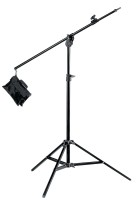 El soporte soporta cargas pesadas de hasta 70 kg en su extensión máxima y está equipado con amortiguación neumática que protege el equipo durante el ajuste de altura. El amplio diámetro de la base, de 213 cm, con patas de sección cuadrada, garantiza una estabilidad excelente, mientras que la fijación superior estándar de 1-1/8" (28 mm) permite la compatibilidad con equipos de iluminación y accesorios profesionales. El soporte B150-1, certificado según las normas TÜV-GS y CE, es una solución fiable para producciones profesionales exigentes.