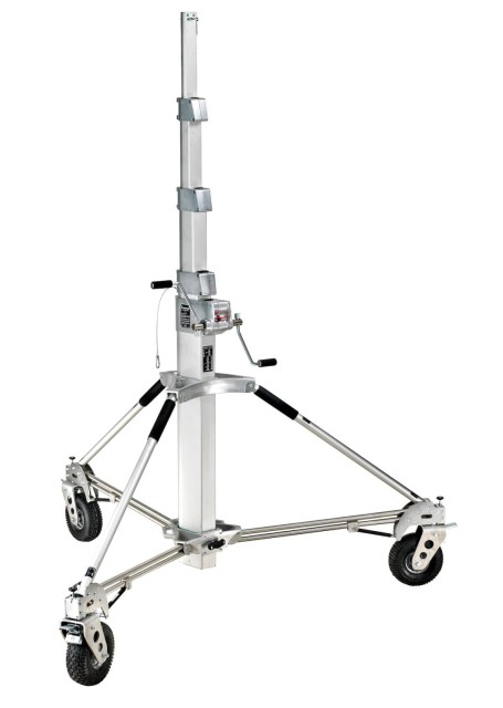 El trípode está equipado con un sistema de elevación por cabrestante de 5 secciones que permite una elevación precisa y controlada del equipo hasta una altura máxima de 5,70–5,78 m. Está fabricado principalmente en acero con componentes de aluminio en el poste y ofrece una resistencia excepcional al tiempo que mantiene una elevación suave. El sistema integrado de suspensión neumática proporciona una protección adicional al equipo montado durante el ajuste de la altura.