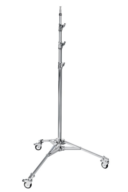 El Avenger A5043 Roller Stand 43 con base baja es un robusto trípode de acero cromado y aluminio con ruedas con freno, tres secciones extensibles y un soporte Baby de 5/8", capaz de soportar hasta 12 kg y alcanzar una altura máxima de 430 cm.