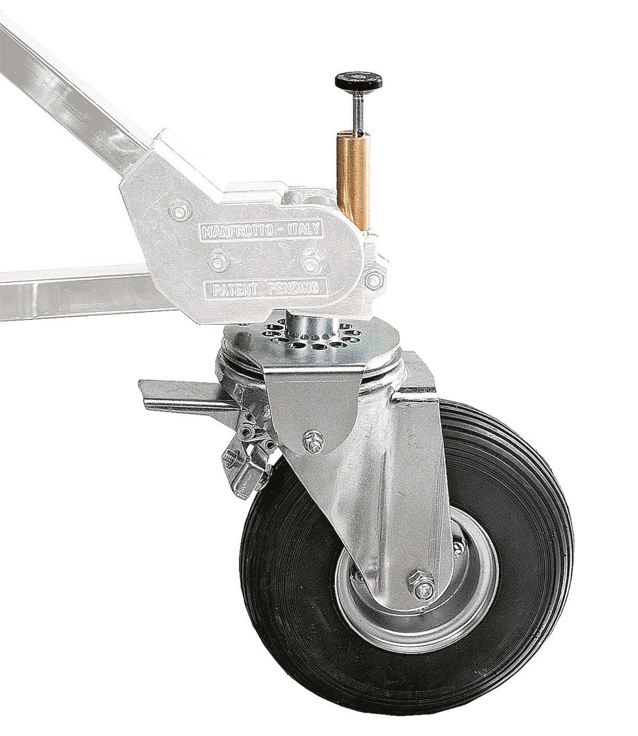 Las ruedas están diseñadas para entornos de estudio profesionales y trabajos exigentes sobre el terreno. El acolchado de goma garantiza un movimiento fluido sobre una amplia variedad de superficies y minimiza las vibraciones y los daños en el suelo. El mecanismo giratorio cuenta con 12 posiciones de bloqueo, lo que permite un posicionamiento preciso y un control direccional al manipular equipos pesados.