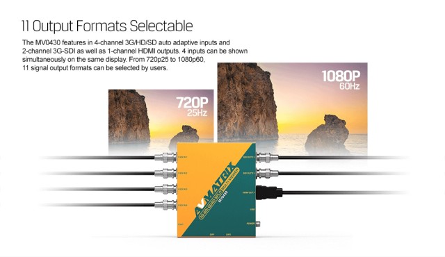 El MV0430 es un excelente y profesional multiviewer SDI, equipado con entradas 3G/HD/SD-SDI de 4 canales con adaptación automática y salidas 3G-SDI de 2 canales y HDMI de 1 canal. Hay un total de 16 diseños preconfigurados entre los que elegir. Los usuarios también pueden ajustar libremente el tamaño y la posición de la superposición UMD de 11 caracteres y…
