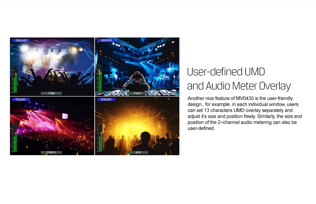 El MV0430 es un excelente y profesional multiviewer SDI, equipado con entradas 3G/HD/SD-SDI de 4 canales con adaptación automática y salidas 3G-SDI de 2 canales y HDMI de 1 canal. Hay un total de 16 diseños preconfigurados entre los que elegir. Los usuarios también pueden ajustar libremente el tamaño y la posición de la superposición UMD de 11 caracteres y del medidor de audio. Todas las funciones se pueden configurar fácilmente mediante el conmutador DIP integrado o un ordenador a través de la red LAN. El MV0430 es la opción ideal para aplicaciones de retransmisión y posproducción audiovisual.