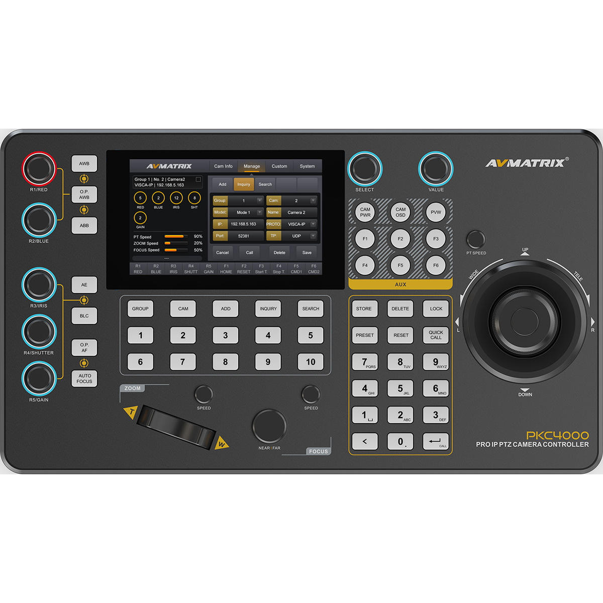 Optimice su configuración de múltiples cámaras con el AVMatrix PKC4000. Este controlador, equipado con una pantalla táctil de 5 pulgadas, un joystick 4D y compatibilidad con los protocolos Visca, Pelco P&D, ONVIF e IP, es capaz de gestionar hasta 100 cámaras PTZ con decodificación de vídeo en tiempo real. Controle fácilmente la exposición, la apertura, el enfoque y el movimiento. Alimentado por PoE o 12 V CC, es ideal para estudios, eventos en directo y entornos de retransmisión.