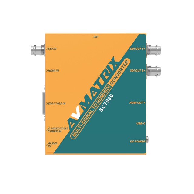 El AvMatrix SC7030 es un escalador y convertidor de vídeo de alto rendimiento diseñado para la producción y emisión de vídeo profesional. Admite una amplia gama de formatos de entrada, incluidos SDI, HDMI, DVI-I, VGA, CVBS, S-Video y YPbPr, lo que garantiza una gran compatibilidad. Gracias a sus dos salidas SDI y HDMI, ofrece una distribución de vídeo flexible. El modelo SC7030 permite el escalado ascendente/descendente, la conversión de frecuencia de fotogramas y el ajuste de la relación de aspecto (4:3/16:9), lo que garantiza una integración perfecta en diversos flujos de trabajo. Otras características incluyen la integración de audio analógico, indicadores LED para señales de vídeo y de alimentación, y un control sencillo mediante interruptores DIP o software para PC. Se alimenta a través de una conexión roscada con bloqueo de 12 V CC o USB-C de 5 V, y el soporte extraíble opcional permite una instalación flexible.