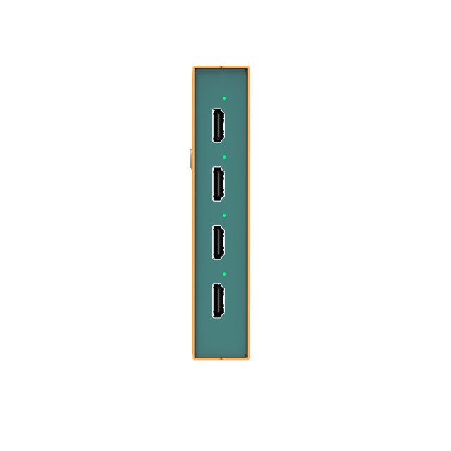 Amplificador distribuidor HDMI 4K60 1×4 con pantalla integrada. Alimentación USB-C/CC, montaje en rack opcional.