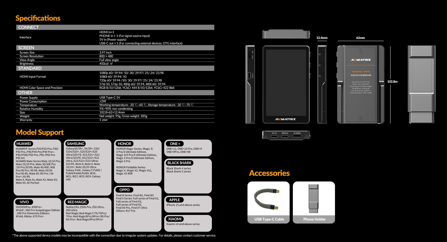 Monitor AVMatrix Vlog Selfie. 3 puertos tipo C; la salida USB-C es compatible con la función OTG para conectar accesorios USB, como luces adicionales, y proporciona alimentación de salida. Compatible con la mayoría de los smartphones de gama alta con puertos tipo C totalmente funcionales; admite entrada HDMI 1080p. Pantalla de 3,97 pulgadas con interacción entre dos pantallas en tiempo real.