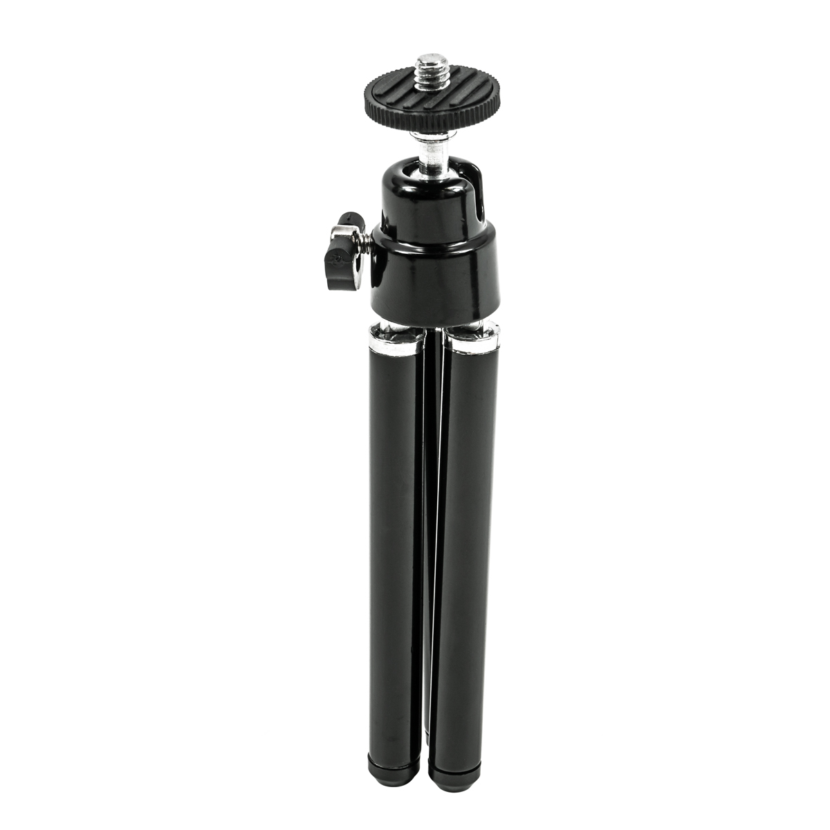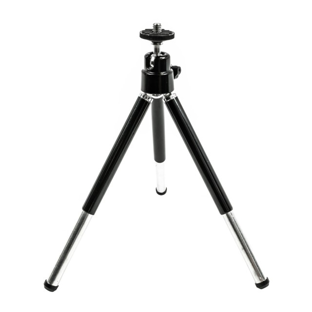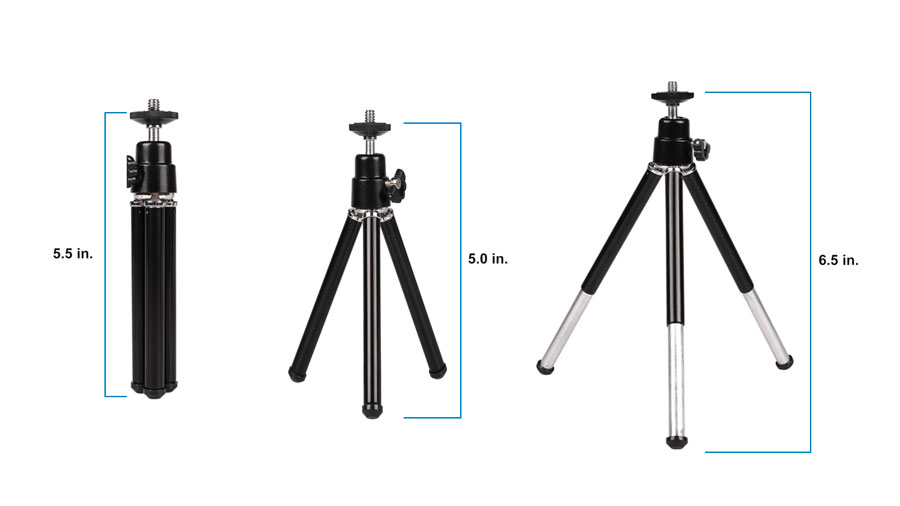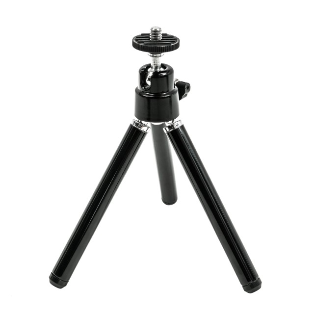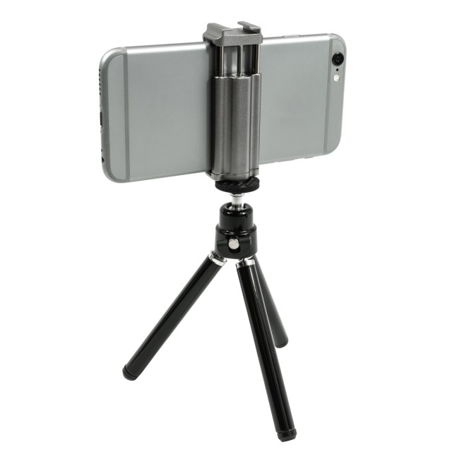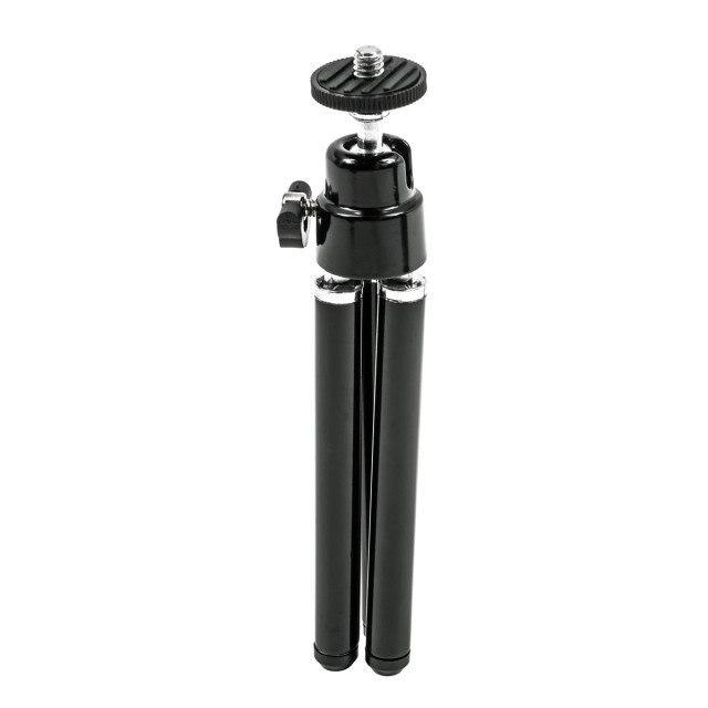 Soporte para trípodeEste trípode miniatura ligero funciona bien como soporte de mesa para tu smartphone o, al plegar las patas, se convierte en un mango para grabar vídeos sobre la marcha. Las patas extensibles permiten ajustar la altura del trípode en un rango de 5,0 a 6,5 pulgadas. El cabezal articulado con rótula permite ajustar la inclinación y el ángulo ideales. La inclinación de 90º para la orientación vertical es posible gracias al lado estriado, mientras que el cabezal se puede fijar en su sitio mediante un tornillo de cabeza de mariposa. Gracias a la rosca de montaje universal de ¼"-20, el trípode también es compatible con otras cámaras pequeñas.