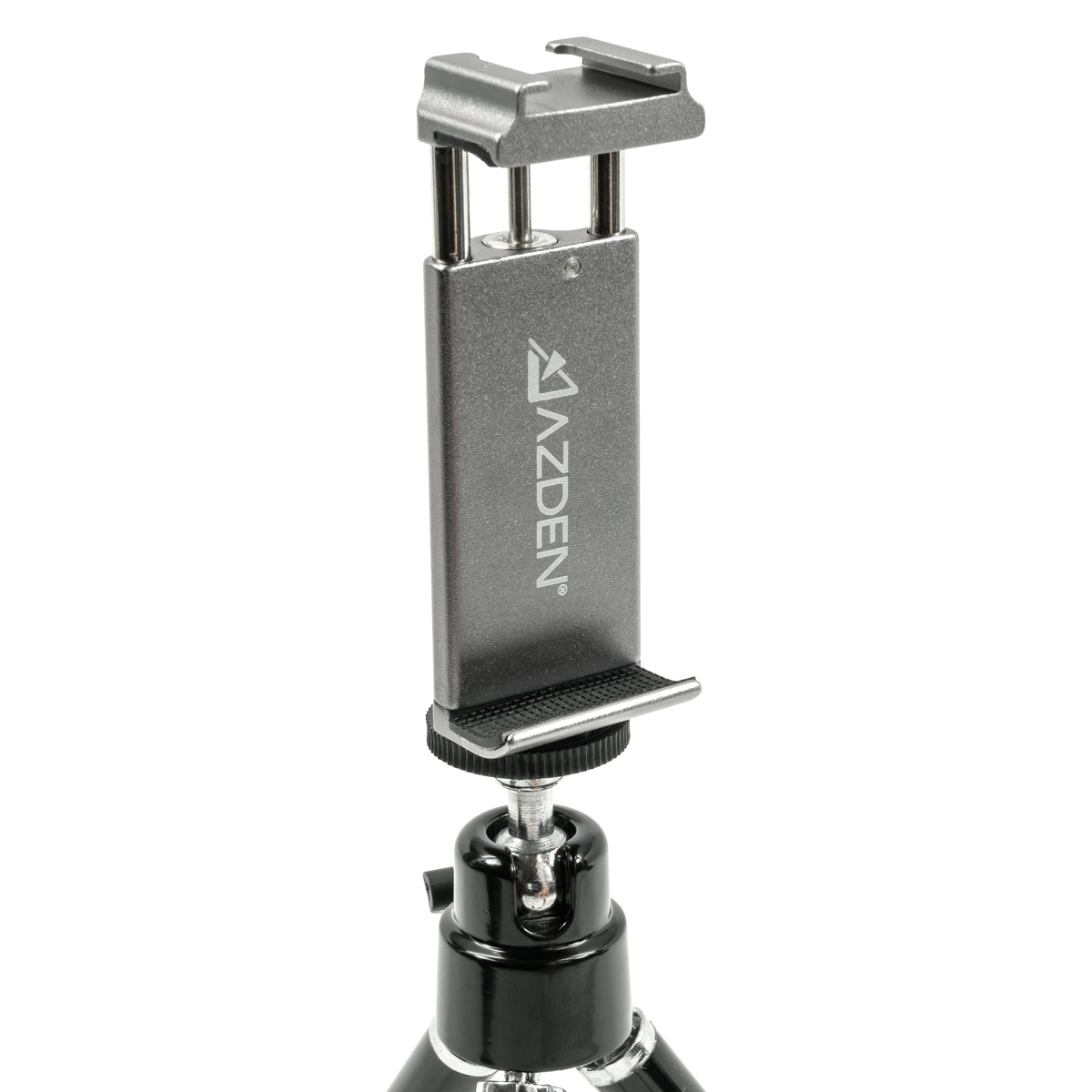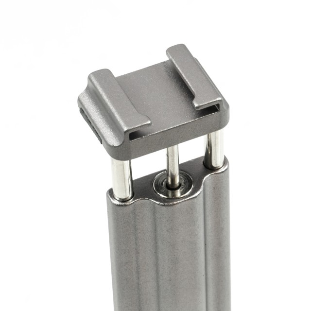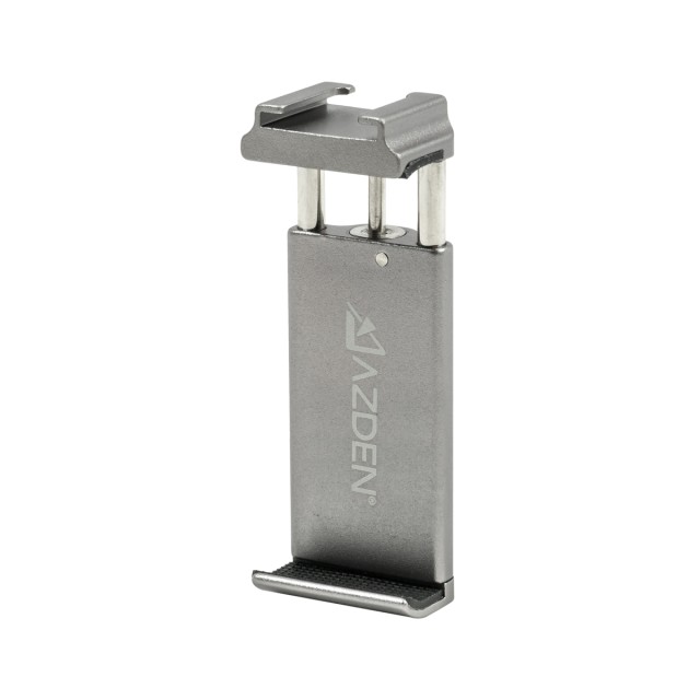 Soporte para smartphoneEl soporte incluido utiliza una abrazadera con resorte que se adhiere firmemente a casi cualquier smartphone. Se adapta a teléfonos con un ancho de entre 2,4 y 3,3 pulgadas, por lo que es compatible incluso con los smartphones más grandes (phablets) del mercado actual. A diferencia de muchos otros soportes para teléfonos, el nuestro está equipado con una ranura cold-shoe que permite acoplar un micrófono, un receptor inalámbrico u otros accesorios. El soporte en sí se puede fijar al trípode incluido en el paquete o a cualquier otro soporte o barra de cámara mediante un orificio roscado de ¼"-20. El soporte está fabricado para durar, tiene una estructura totalmente metálica y ha sido sometido a pruebas de calidad que garantizan una resistencia de más de 6000 accionamientos.