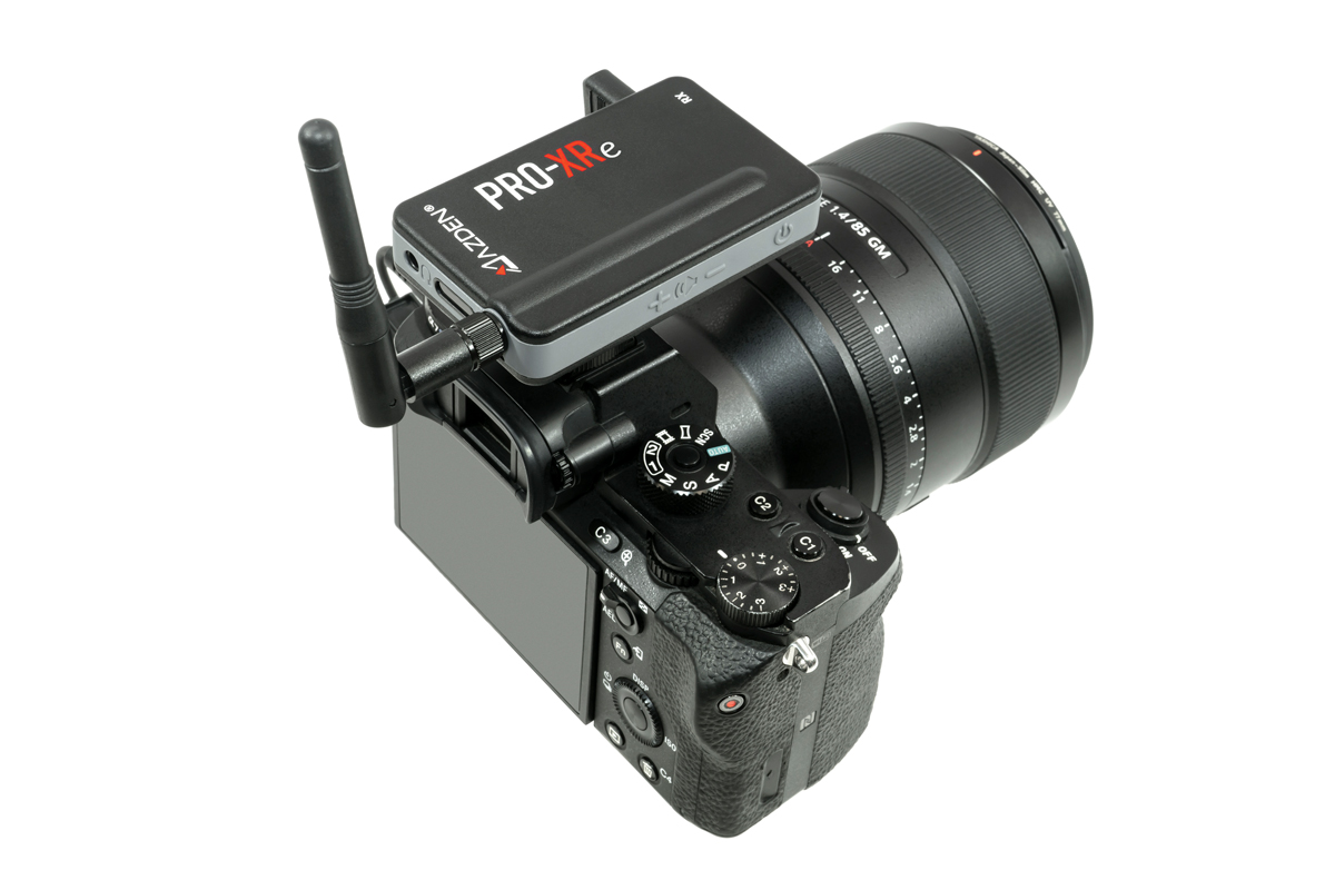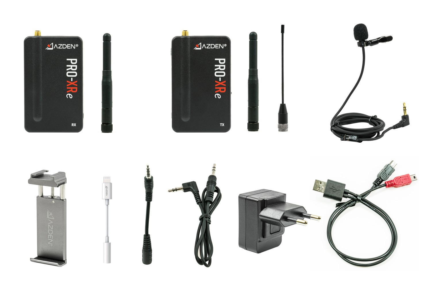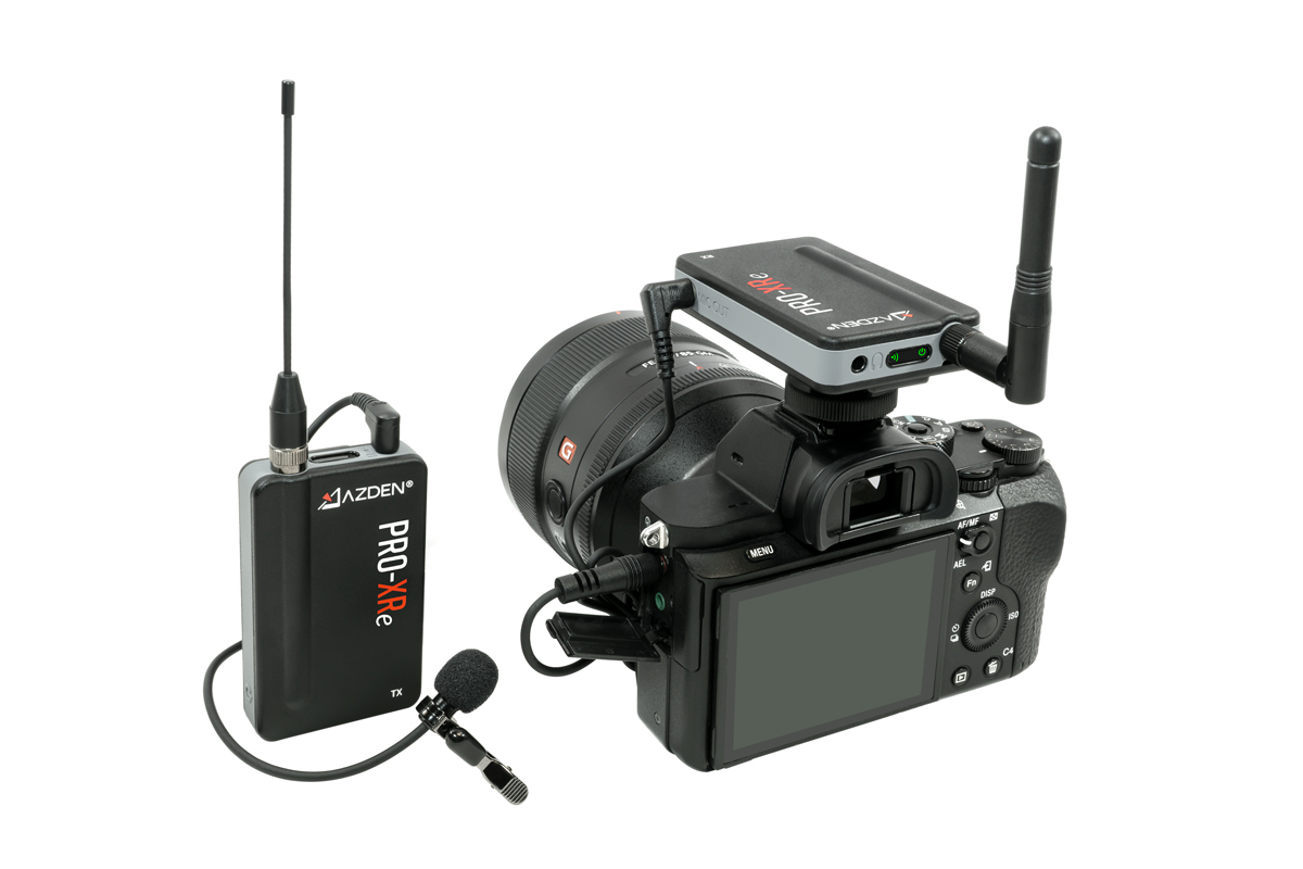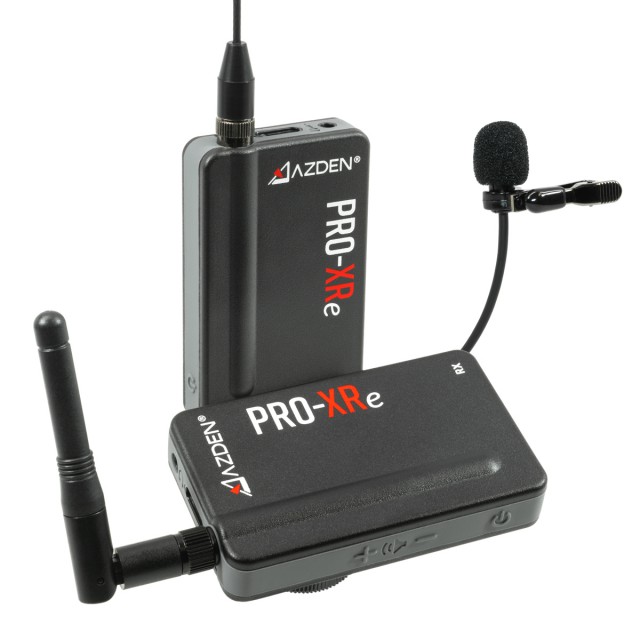 Sistema de micrófono inalámbrico digitalAzden PRO-XRe de 2 ,4 GHz con tecnología de redundancia de señal, alcance de hasta 106 m en condiciones óptimas, 20 horas de autonomía, cables TRRS y de 3,5 mm para el flash incluidos, soporte para teléfono y cargador doble mini-USB