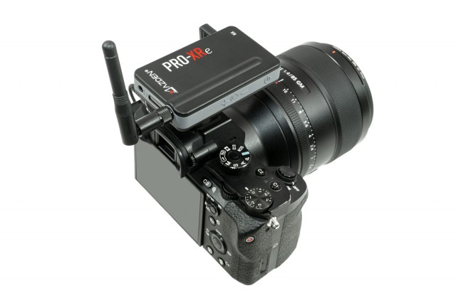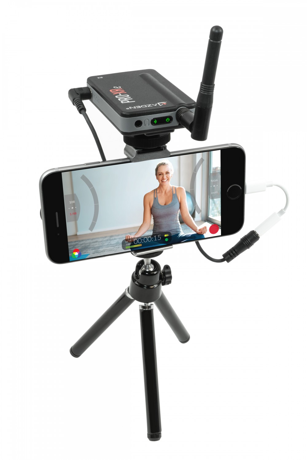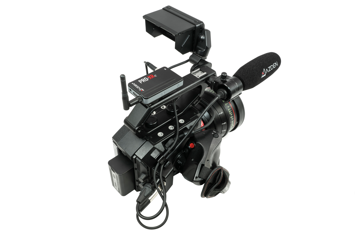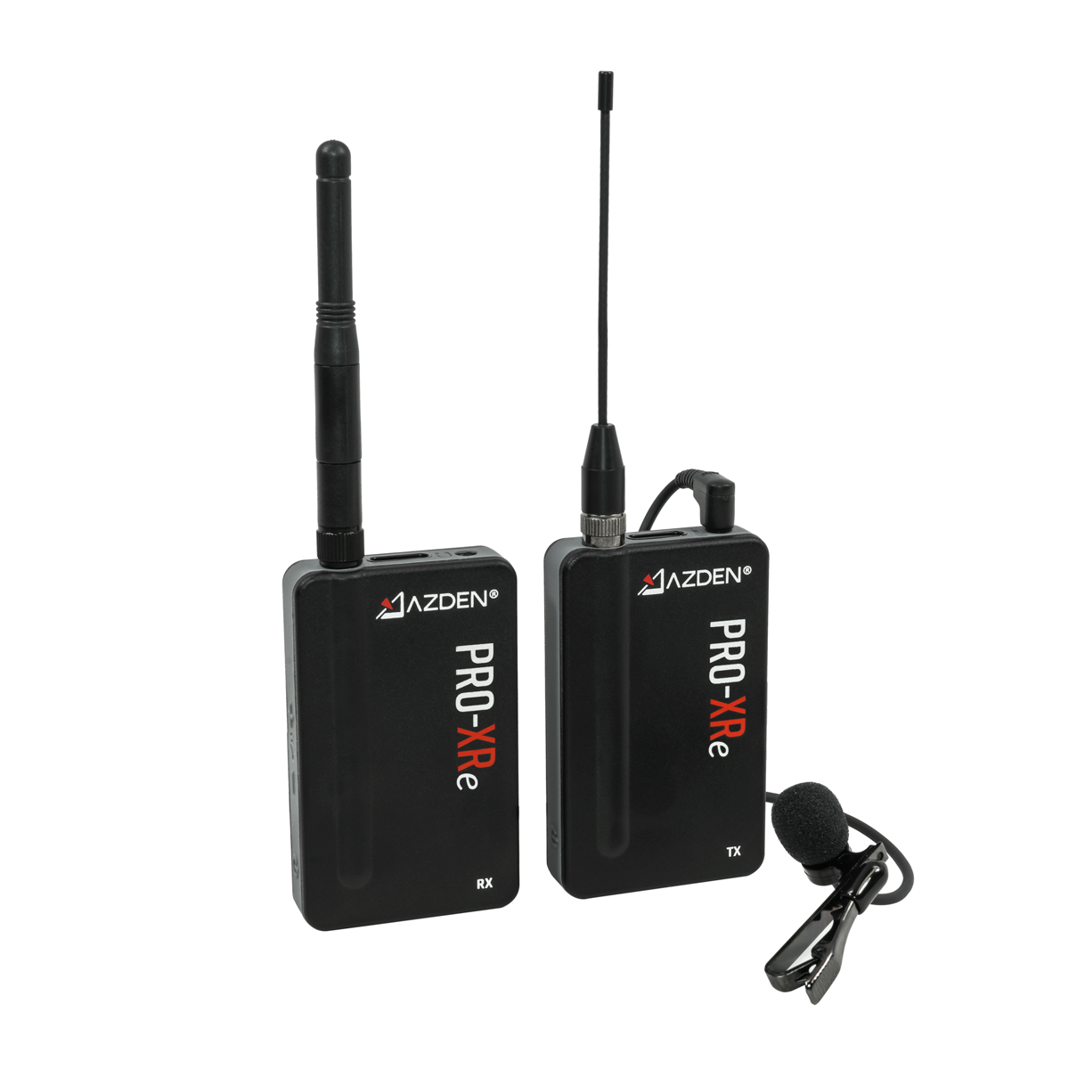 Sistema de micrófono inalámbrico digitalAzden PRO-XRe de 2 ,4 GHz con tecnología de redundancia de señal, alcance de hasta 106 m en condiciones óptimas, 20 horas de autonomía, cables TRRS y de 3,5 mm para el flash incluidos, soporte para teléfono y cargador doble mini-USB