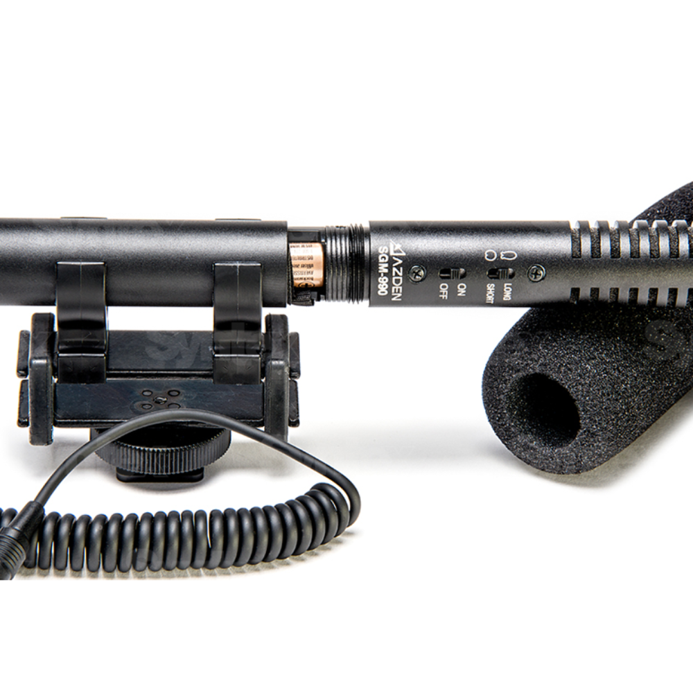 El Azden SGM-990+i es un micrófono de cañón de 15 cm con patrón polar conmutable, diseñado para cámaras DSLR/DSLM (conector jack de 3,5 mm) y dispositivos móviles (compatible con el adaptador TRRS incluido; tabla de compatibilidad aquí). Su característica única es la posibilidad de cambiar entre una característica direccional estrecha y amplia: el modo «Long» está diseñado para grabar sonido a mayor distancia y suprimir en gran medida el sonido lateral, mientras que el modo cardioide «Short» sirve para grabar a distancias más cortas. Ambos modos proporcionan una buena supresión del sonido procedente de la semiesfera trasera y de los laterales.