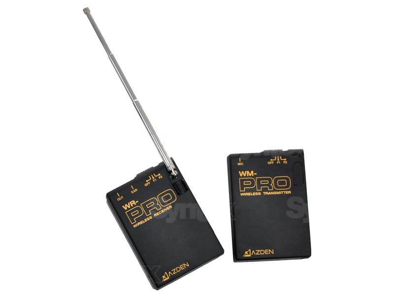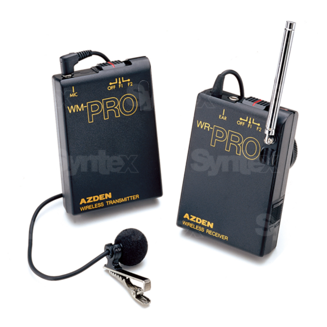 El Azden WLX-PROes un sistema completo que incluye el transmisor de petaca WM-PRO, el micrófono electret EX-503 y el receptor WR-PRO, que se suministra con una montura de zapata y una banda de velcro. Todos los transmisores y receptores de la serie PRO funcionan en dos frecuencias idénticas (169,445 MHz y 170,245 MHz).