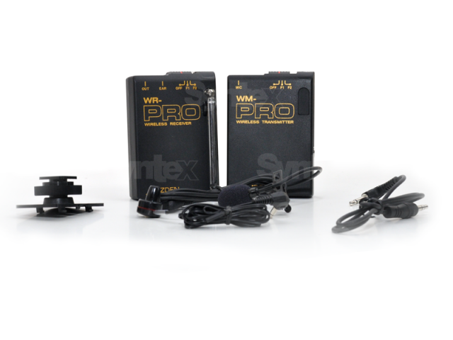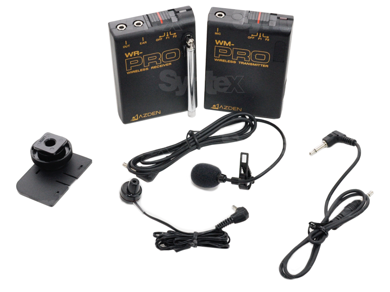 El Azden WLX-PROes un sistema completo que incluye el transmisor de petaca WM-PRO, el micrófono electret EX-503 y el receptor WR-PRO, que se suministra con una montura de zapata y una banda de velcro. Todos los transmisores y receptores de la serie PRO funcionan en dos frecuencias idénticas (169,445 MHz y 170,245 MHz).