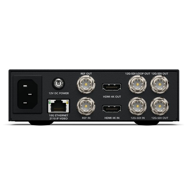 El producto está equipado conlos conectores de vídeo 12G-SDI más recientes. Esto significa que con un solo dispositivo puede conectar tanto equipos de emisión clásicos a través de SDI como modernos sistemas de emisión basados en la tecnología IP SMPTE-2110. El 12G-SDI es multirate, lo que significa que un solo cable BNC puede transmitir la señal desde cualquier dispositivo en formatos HD y Ultra HD. Se admiten: 720p HD a 720p50 y 59,94p; 1080i HD (señal entrelazada) a 1080i50 y 1080i59,94; 1080p HD a 23,98, 24, 25, 29,97, 30, 50, 59,94 y 60p; Ultra HD (2160p) en todos los estándares de televisión: 23,98, 24, 25, 29,97, 50, 59,94 y 60p.