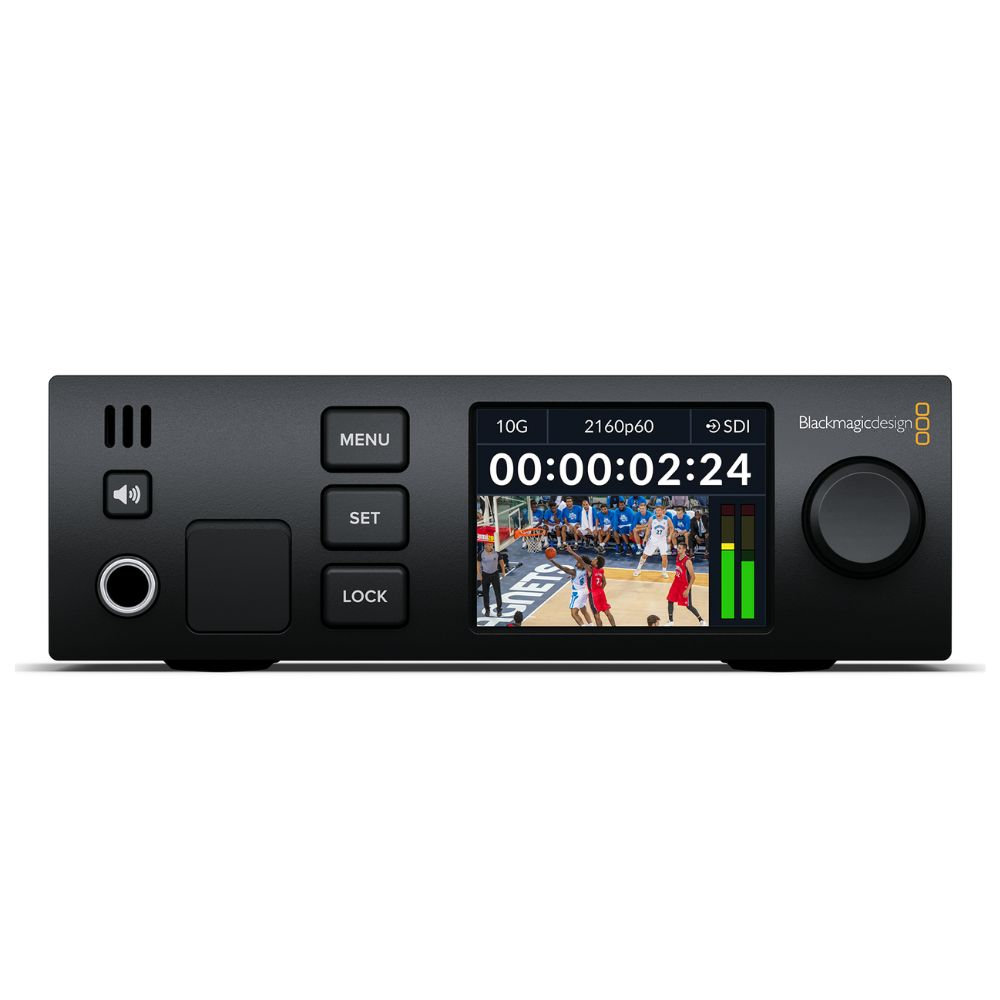 El Blackmagic 2110 IP UpDownCross 12G es un convertidor de estándares de alta gama diseñado para la producción en directo y la emisión televisiva. Presenta un diseño elegante con pantalla LCD, altavoz integrado y salida para auriculares. En la pantalla LCD también encontrará menús para configurar el estándar de vídeo.