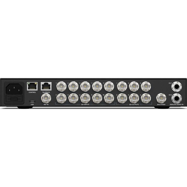 La función multiview integrada permite a los usuarios ver varias fuentes de vídeo en un solo monitor. El modelo 1 M/E incluye una, mientras que el modelo 2 M/E cuenta con dos salidas multiview independientes. Todas las entradas SDI externas y las fuentes de vídeo internas se pueden dirigir a cualquier vista. La vista multiview es totalmente personalizable y se puede configurar de forma independiente para mostrar 4, 7, 10, 13 o 16 vistas simultáneas. Los usuarios pueden añadir a cada vista, como elemento superpuesto, un marco que muestra el estado de la señal, además de la identificación de la fuente y los medidores VU.