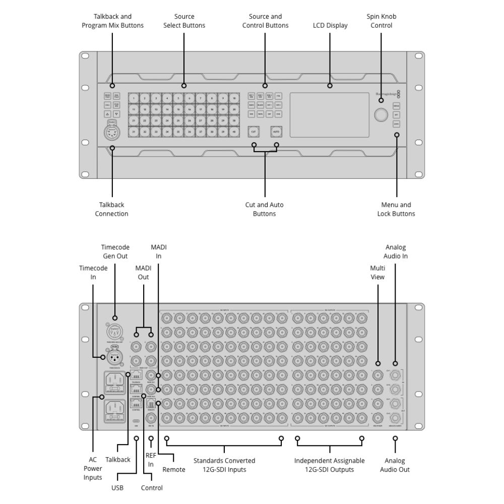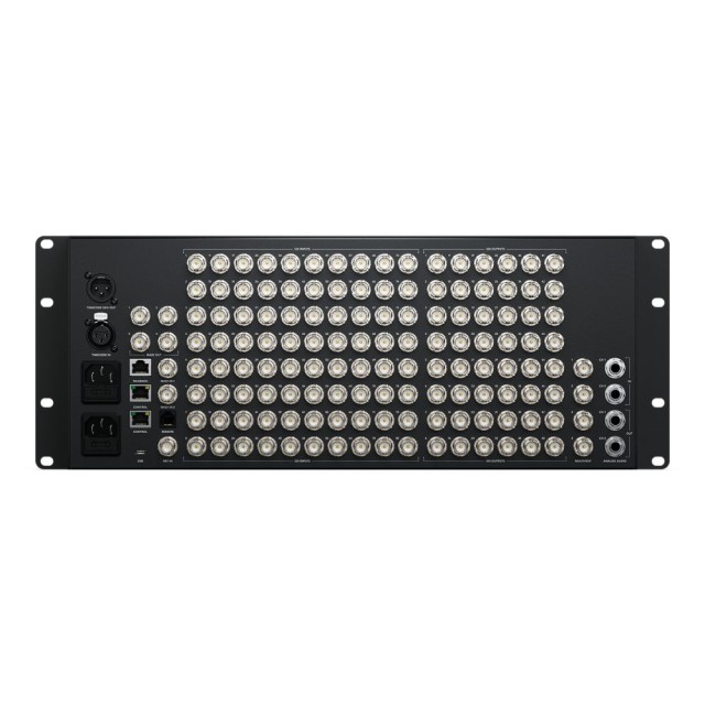 Cada entrada del dispositivo cuenta con un convertidor independiente, lo que permite convertir cualquier entrada de vídeo SDI al estándar de salida del conmutador. Es posible que cada entrada SDI del conmutador utilice un estándar de televisión diferente, y todas funcionarán sin problemas. Incluso puede enviar el audio a varias salidas MADI digitales, lo que le permite transmitir las fuentes de audio del conmutador a un técnico de sonido externo para que las mezcle por separado.