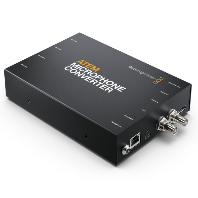El Blackmagic Design ATEM Microphone Converter es un convertidor A/D que amplía las mesas de regidor ATEM (por ejemplo, la ATEM Television Studio HD8) con entradas adicionales para micrófono y de línea. Se conecta mediante la interfaz MADI (BNC) y ofrece parámetros de audio de primera clase, incluyendo un nivel de ruido propio de -129 dBV, un rango dinámico de 131 dB(A), una distorsión muy baja del 0,002 % y una alta uniformidad de los parámetros en todos los canales. Otra característica interesante es la salida de monitorización HDMI para visualizar los niveles y la forma de onda de la señal.