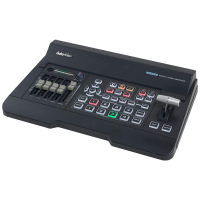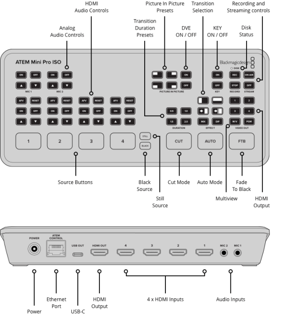 Las consolas ATEM Mini están equipadas con un panel integrado y compacto con botones para seleccionar entradas y efectos. Los modelos ATEM Mini Pro ofrecen además botones para controlar la grabación y la transmisión, así como para cambiar la salida entre las cámaras y los modos Programa y Multiview. El panel trasero cuenta con entradas HDMI para cámaras u otras fuentes de vídeo, entradas de micrófono, una interfaz USB y una salida HDMI «Aux».