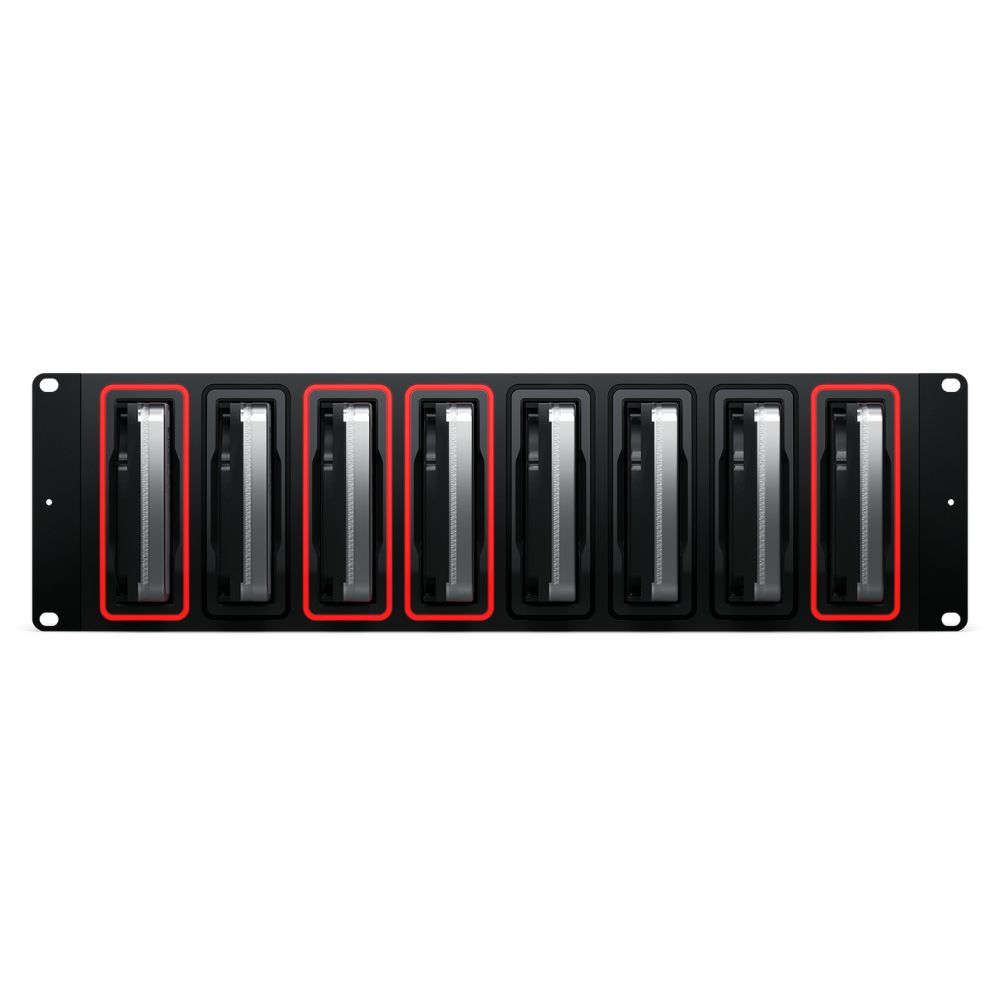 Elelegante diseño de montaje en rack del Blackmagic Cloud Backup 8 lo convierte en la opción ideal para su instalación en el estudio junto a otros equipos de red o, por ejemplo, para realizar copias de seguridad del material de las cámaras en el carro DIT directamente en el plató. El dispositivo ofrece 8 ranuras independientes para discos duros, y todos los discos están disponibles simultáneamente a través de la red. Cada ranura cuenta con un elegante anillo luminoso que indica la actividad del disco, para que siempre sepa cuándo se está leyendo o escribiendo en él.