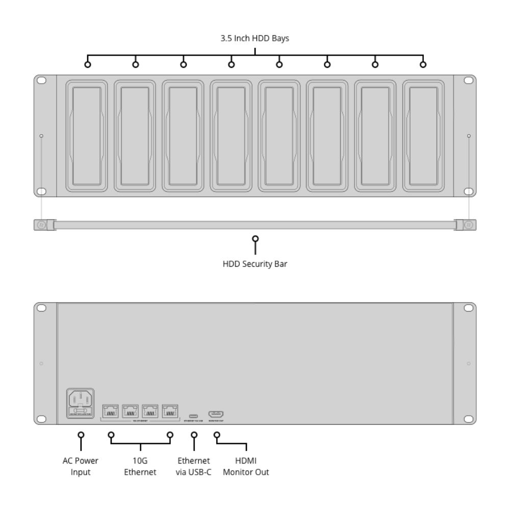 Gracias a la compatibilidad con Blackmagic Cloud, los archivos se puedensincronizar a nivel global, lo que te permite realizar copias de seguridad incluso de los proyectos en los que colaboras en DaVinci Resolve. Puedes supervisar toda la actividad del almacenamiento, las conexiones y la sincronización en tiempo real en una pantalla conectada a través de la salida de monitorización HDMI. Blackmagic Cloud Backup 8 incluye 4 puertos Ethernet de 10G para compartir en red, un puerto Ethernet a través de USB-C y una fuente de alimentación integrada, todo ello en un elegante diseño para rack.