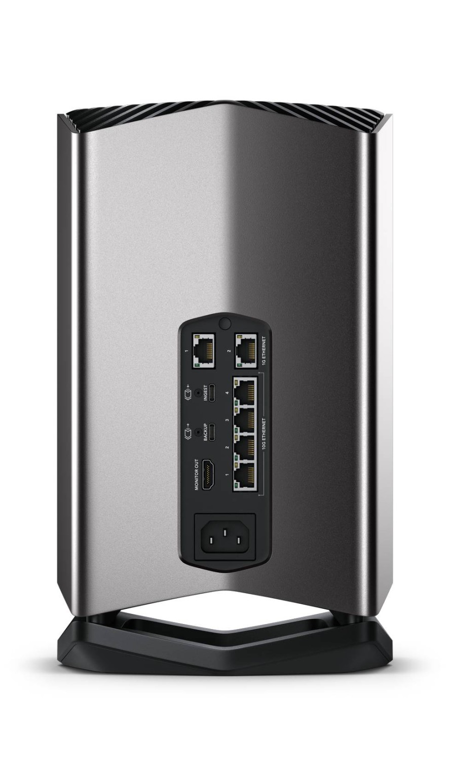 A diferencia de las soluciones de servidor instaladas en armarios y equipadas con sistemas de refrigeración ruidosos, el Blackmagic Cloud Store ofrece un diseño vertical elegante y fácilmente transportable, además de un funcionamiento silencioso. Su corazón es una matriz de tarjetas flash M.2 conectadas en paralelo para garantizar la máxima velocidad y seguridad de los datos. Los cuatro puertos Ethernet de 10 G y el conmutador interno se pueden utilizar, por ejemplo, para conectar cuatro ordenadores o como una única interfaz con un ancho de banda teórico cuádruple; también hay disponibles dos puertos Ethernet de 1 G. La salida de monitorización HDMI permite supervisar la actividad del almacenamiento en un monitor externo en tiempo real.