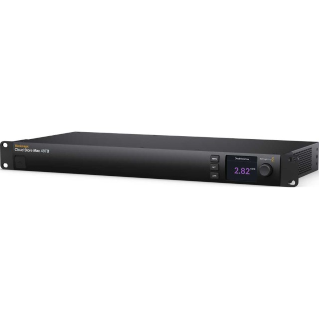 Blackmagic Cloud Store Max es la nueva gama de dispositivos de almacenamiento en red Cloud Store con un tamaño de 1RU. Cloud Store Max ofrece un almacenamiento flash de alto rendimiento con modelos de 24 o 48 TB de capacidad, memoria flash en configuración RAID 0 con 12 tarjetas, 4 puertos Ethernet de 10 G, Ethernet de 100 G, USB-C y sincronización Blackmagic Cloud para la distribución global de archivos. Disponible a partir de mayo de 2024.