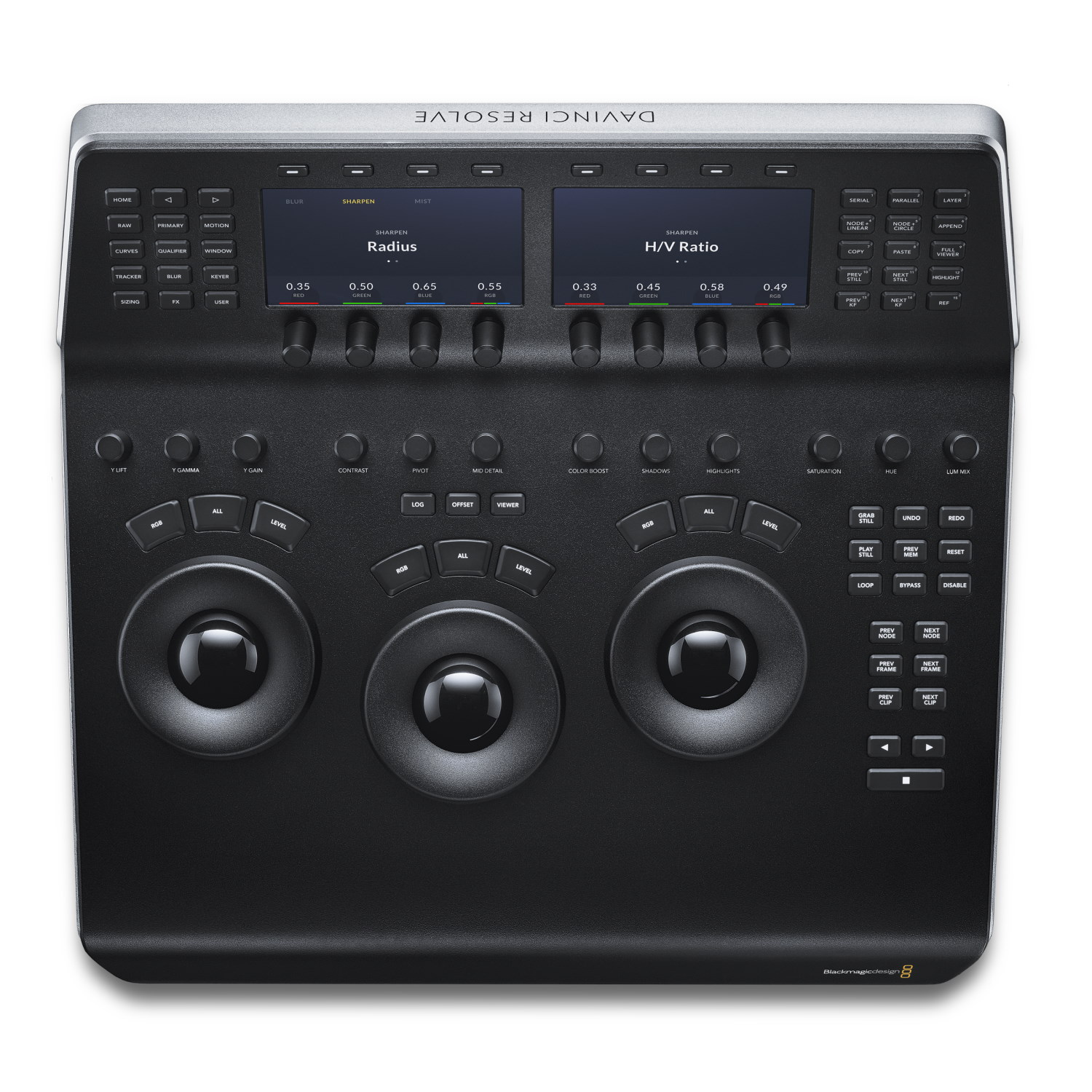 El panel ofrece tres trackballs de alta resolución, 12 controles giratorios para correcciones de color primarias y 18 botones de navegación y transporte, así como un panel vertical con dos pantallas de 5 pulgadas, 8 botones y el mismo número de controles giratorios, así como controles específicos en los laterales para la navegación por la línea de tiempo y el manejo de las funciones avanzadas del programa DaVinci Resolve.