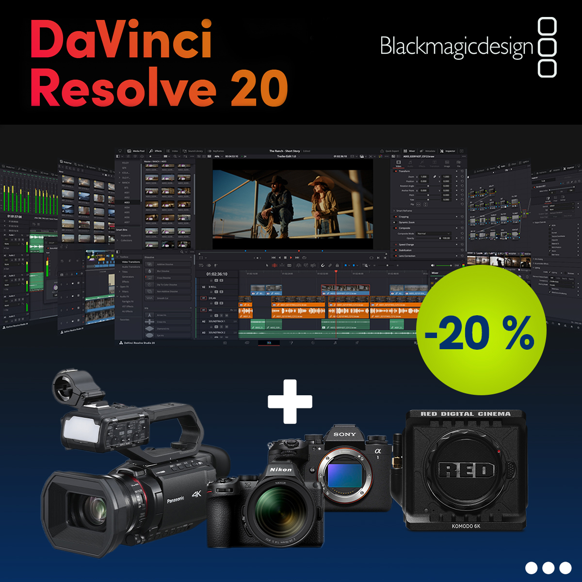 Puedes elegir entre una gran variedadde cámaras, incluyendo la RED KOMODO y decenas de modelos de Sony, Nikon y Panasonic. ¡Hazte, por ejemplo, con la popular novedad Nikon Z 5 II, la Sony A1 II o la Panasonic AG-CX20EJ y obtén este software de vanguardia para la edición y la corrección de color con un 20 % de descuento!
