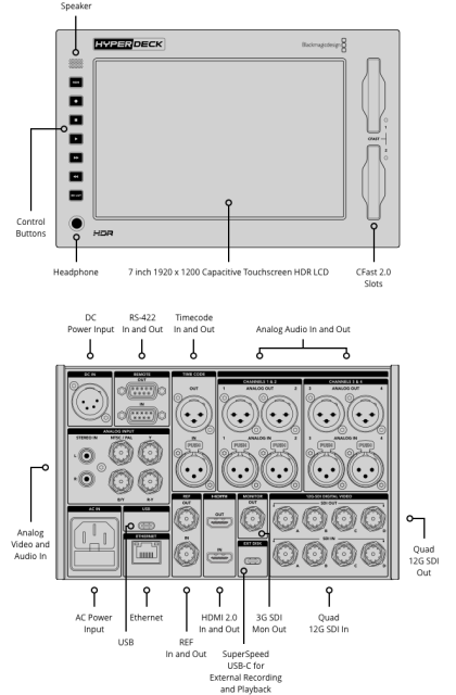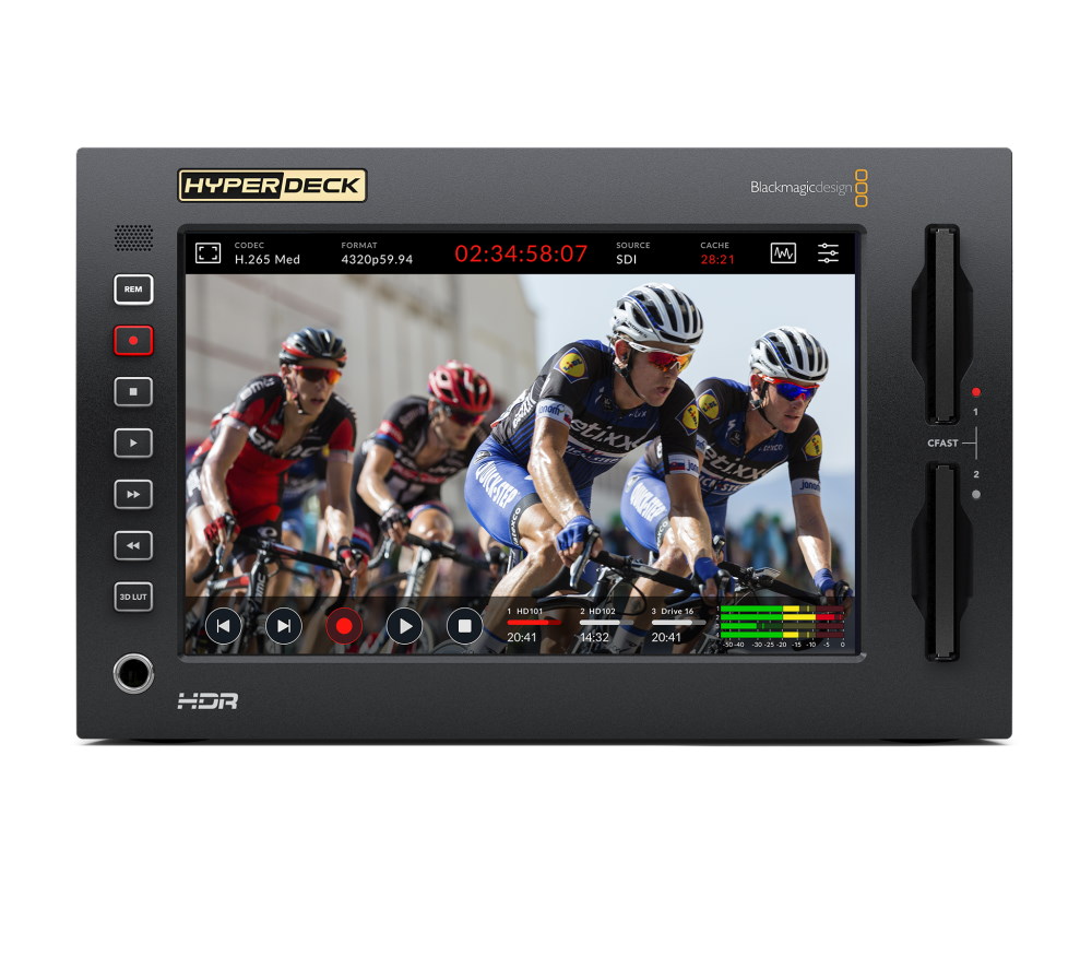 El HyperDeck Extreme cuenta con una pantalla táctil para controlar todas las funciones, así como para previsualizar la grabación. Tras instalar el módulo HyperDeck Extreme Control, también se puede controlar mediante los botones de transporte tradicionales y la rueda Jog/Shuttle; además, existe la posibilidad de montar ambos dispositivos en armarios de equipo mediante un bastidor opcional. HyperDeck Extreme ofrece además dos ranuras para soportes de grabación CFast, una interfaz Quad-Link 12G-SDI para el formato 8K, una interfaz analógica para el archivo de programas antiguos, la posibilidad de grabar en discos USB-C externos, un altavoz integrado y una salida de auriculares. Otra característica interesante es la instalación de una memoria intermedia opcional para eliminar la pérdida de fotogramas cuando el soporte de grabación se llena o falla. El dispositivo puede alimentarse tanto de fuentes de tensión de CA como de CC para uso en estudio o trabajo sobre el terreno.