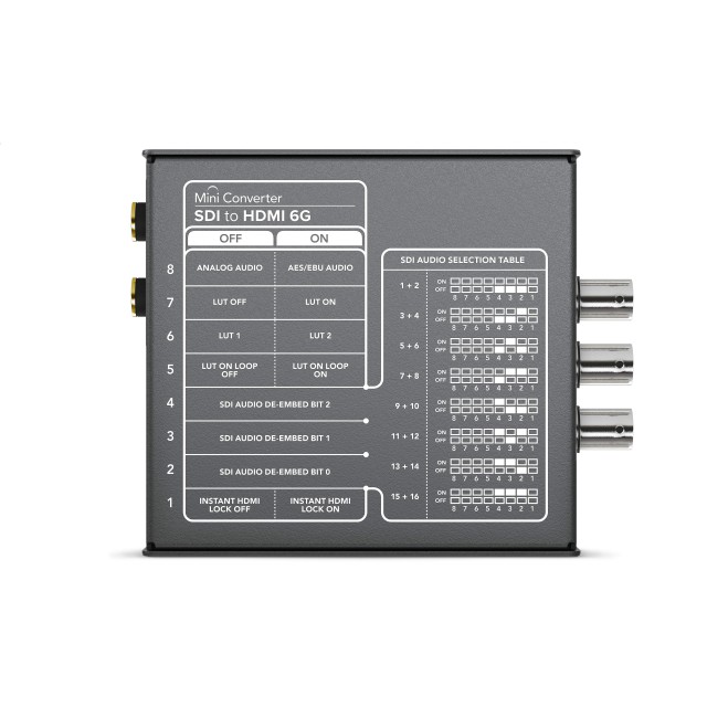 El modelo Mini Converter SDI to HDMI 6G también ofrece compatibilidad total con tablas 3D LUT de 33 puntos para una conversión de color de gran precisión. Las correcciones LUT se pueden aplicar, por ejemplo, para previsualizar los ajustes de color previstos en el vídeo, directamente durante la grabación. Los archivos 3D LUT son compatibles con la aplicación DaVinci Resolve, por lo que se pueden utilizar las mismas correcciones de color tanto durante la producción como durante la posproducción del material de vídeo. El soporte de audio es igualmente amplio: el modelo Mini Converter SDI a HDMI 6G es capaz de desincrustar el audio de una línea SDI a HDMI; por el contrario, el producto HDMI a SDI 6G se puede utilizar para incrustar audio en una señal SDI desde HDMI, entradas de audio analógicas simétricas o digitales AES/EBU.