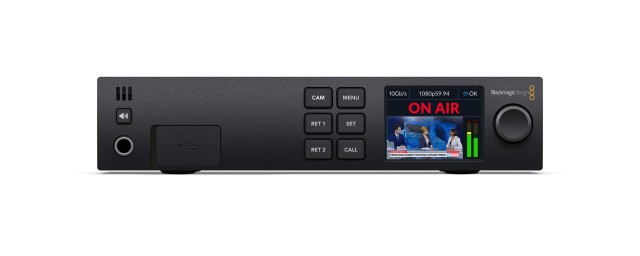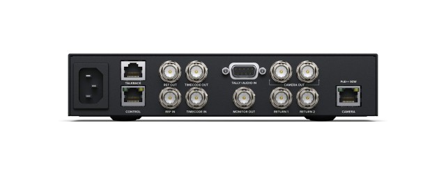 Adaptador opcional para la interfaz Ethernet 10G de la cámara Blackmagic Studio Camera 4K permite transmitir la imagen, las señales de control, el canal de comunicación y la alimentación de la cámara mediante un único cable, de forma similar a la interfaz híbrida SMPTE Fiber, pero a un precio considerablemente más bajo gracias al cable Ethernet de clase Cat 6A. El Blackmagic Studio Converter se encarga de toda la conversión en la sala de control y complementa la interfaz Ethernet con alimentación PoE para la cámara. Ofrece 2 E/S 12G-SDI, una salida de monitorización 3G-SDI, 1 puerto RJ-45 10G Ethernet con soporte PoE, entradas/salidas para código de tiempo y señal de referencia (Tri-Sync o Black Burst), talkback (canales SDI 13-16 y RJ-45), pantalla LCD de 2,2", salida de auriculares y altavoz integrado, etc. A la venta a partir de diciembre de 2021.