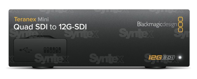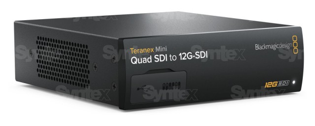 El modelo Teranex Mini Quad SDI to 12G-SDI convierte la señal Quad-Link SDI al estándar más reciente 12G-SDI para conectar equipos Ultra HD con interfaz Quad-Link SDI a nuevos dispositivos con entradas 12G-SDI. Permite conectar salidas Ultra HD realizadas a través de cuatro cables coaxiales mediante una única conexión 12G-SDI a los últimos sistemas de control, proyectores, matrices de conmutación, etc.