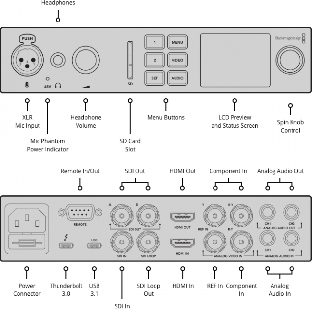 UltraStudio 4K Mini es una solución fácilmente transportable para la grabación y reproducción de vídeo con interfaces Thunderbolt 3, 12G-SDI y HDMI 2.0... Es compatible con todos los formatos de vídeo estándar de 8 y 10 bits hasta DCI 4Kp60, y de 12 bits hasta DCI 4Kp30. El chasis compacto se puede instalar fácilmente en un rack (o funcionar de forma independiente); su uso se ve considerablemente facilitado por el panel frontal, que cuenta con botones de control, una pantalla LCD de vista previa, una entrada de micrófono (XLR), una salida de auriculares de 1/4" y una ranura para tarjetas SD que permite trabajar fácilmente con el material grabado. El panel trasero incluye, por ejemplo, una interfaz USB-C para conectar un teclado y un ratón al ordenador host, así como interfaces SDI, HDMI y A/V analógicas; la interfaz Thunderbolt 3 también admite la recarga del portátil conectado (hasta 45 W).