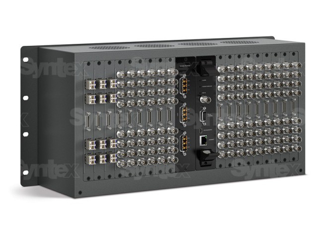 El bastidor permite añadir hasta 18 interfaces SDI BNC o SDI de fibra óptica, además de una única tarjeta de punto de cruce de 72 x 72 y una tarjeta de alimentación. Incluye una bandeja de ventiladores extraíble y ventiladores.