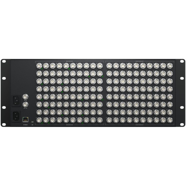 Todos los modelos Blackmagic Videohub 12G están equipados con una interfaz 12G-SDI avanzada que admite cualquier formato de vídeo SD, HD y UHD hasta 2160p60 y se conecta a cualquier dispositivo con interfaces SD, HD-SDI, 3G-SDI, 6G-SDI y 12G-SDI. En el modelo 80x80, los usuarios pueden dirigir hasta 80 señales de vídeo diferentes a 80 salidas simultáneamente. La interfaz 12G-SDI permite transmitir señales Ultra HD a través de un solo cable, con retrocompatibilidad con dispositivos más antiguos. El re-clocking SDI integrado regenera la señal de vídeo para minimizar el jitter.