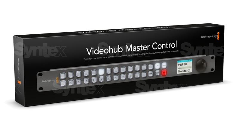 El sofisticado panel de control Videohub Master Control para los routers de la serie Videohub cuenta con un controlador giratorio y una pantalla LCD en color para seleccionar y visualizar las entradas y salidas. La selección de las conexiones también se puede realizar mediante botones programables. La alimentación se realiza mediante una fuente externa de corriente continua o a través de la interfaz Ethernet.