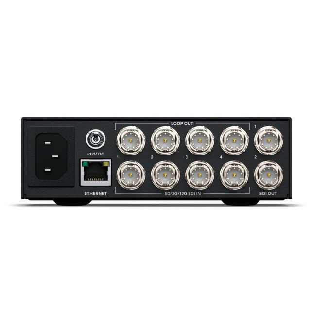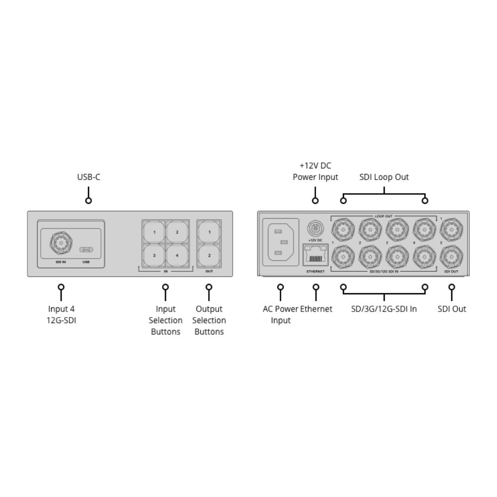 Al Blackmagic Videohub Mini 4x2 12G se le puede conectar cualquier dispositivo con salidas SD, HD-SDI, 3G-SDI, 6G-SDI y 12G-SDI. El 12G-SDI proporciona una alta frecuencia de fotogramas en Ultra HD a través de un único cable BNC, que además es totalmente compatible con los equipos HD habituales. Gracias a ello, puede cambiar fluidamente entre diferentes entradas de vídeo y el estándar de salida SDI se adapta automáticamente. El Videohub es compatible con todos los estándares de vídeo, incluidos 525 NTSC, 625 PAL, 720p, 1080i, 1080p, 2K, 4K y todos los formatos Ultra HD.