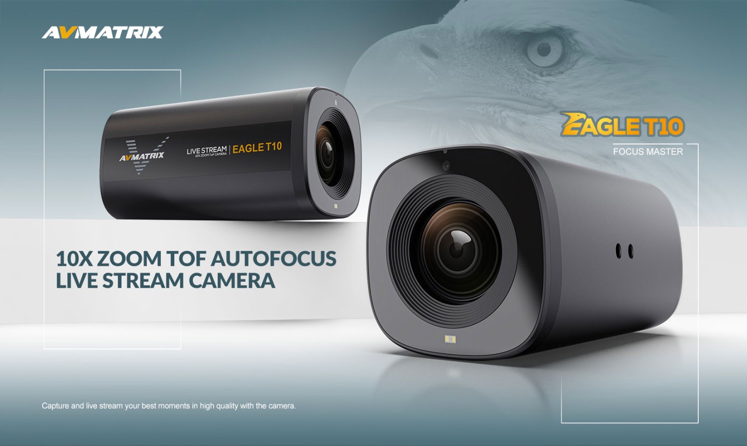 El fabricante AvMatrix ha presentado una serie de novedades, entre las que destaca la cámara HD Eagle T10, compacta y asequible, con interfaces HDMI y USB-C (salida simultánea de hasta 1080p60) para grabación y retransmisión en directo, sensor CMOS de 5 MP y 1/2,8", carcasa resistente de aleación de aluminio, objetivo zoom gran angular integrado (10x), una serie de presets de efectos, mando a distancia por infrarrojos, reducción de ruido 2D/3D, función de inversión de imagen H/V, funciones de AE y AF, etc.