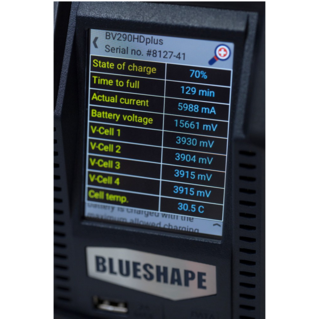 Carga simultánea, hasta 4 baterías instalables, encendido y apagado del ventilador, DC-UPS (sistema de alimentación ininterrumpida AUX), pantalla táctil de 3,5"