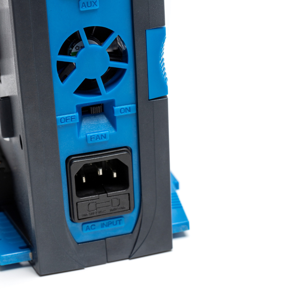 Posibilidad de carga simultánea, hasta 2 baterías instalables, estructura de patas extensibles, ventilador encendido/apagado, DC-UPS (sistema de alimentación ininterrumpida) AUX